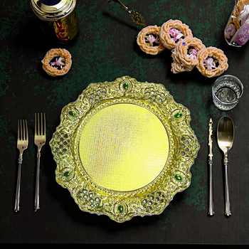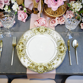 लक्जरी सजावटी प्लास्टिक चार्जर प्लेट गोल क्लासिक डिजाइन टिकाऊ शादी पार्टी व्यंजन थोक आपूर्तिकर्ता की गर्म बिक्री